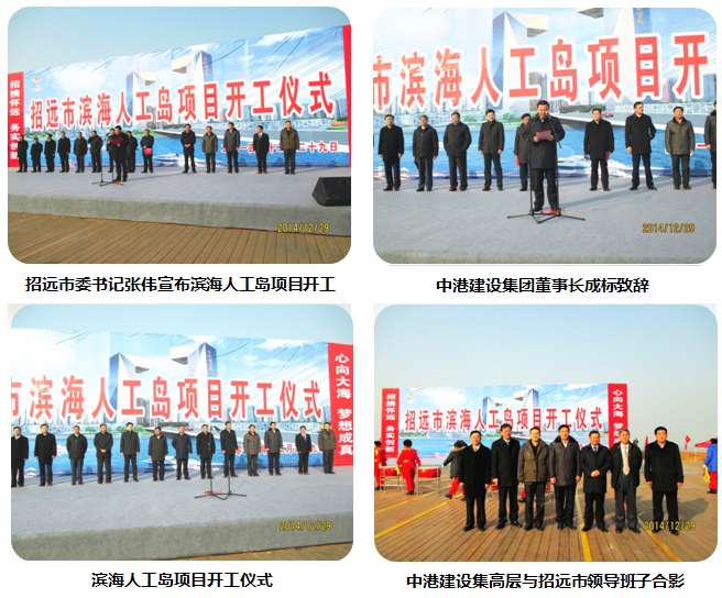 2014年12月29日10點(diǎn)08分,中港建設(shè)集團(tuán)舉行了濱海人工島項(xiàng)目開工儀式。山東省招遠(yuǎn)市領(lǐng)導(dǎo)張偉、王光耀、林建東、徐林宏、郝永平、趙曙光、馬立海等市級(jí)領(lǐng)導(dǎo)班子成員,中港建設(shè)集團(tuán)成標(biāo)董事長(zhǎng)、秦高舉副董事長(zhǎng)、崔大凡副總裁、黃波副總裁等集團(tuán)高管,總承包單位中國(guó)技術(shù)進(jìn)出口公司相關(guān)負(fù)責(zé)人,招遠(yuǎn)市各鎮(zhèn)主要負(fù)責(zé)人,及人工島指揮部成員、各有關(guān)單位一同參加開工儀式。